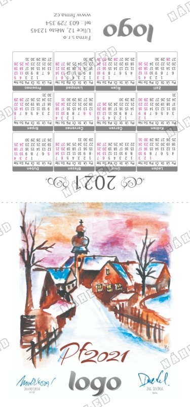 Toto vánoční přání je skládací ve formě karty s kalendářem a úpravou pro přeložení k postavení na stůl jako "Áčko". Přání je do obálky DL. Námi vyráběné novoročenky a vánoční přání jsou tištěny na kvalitním 300g křídovém papíře.