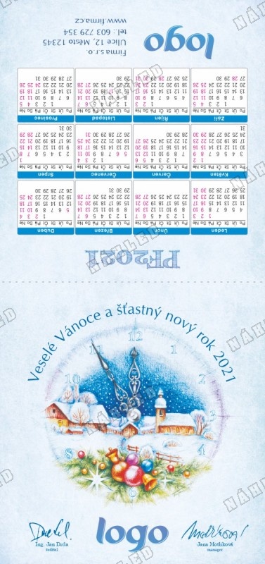 Toto vánoční přání je skládací ve formě karty s kalendářem a úpravou pro přeložení k postavení na stůl jako "Áčko". Přání je do obálky DL. Námi vyráběné novoročenky a vánoční přání jsou tištěny na kvalitním 300g křídovém papíře.