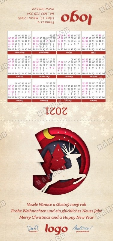 Toto vánoční přání je skládací ve formě karty s kalendářem a úpravou pro přeložení k postavení na stůl jako "Áčko". Přání je do obálky DL. Námi vyráběné novoročenky a vánoční přání jsou tištěny na kvalitním 300g křídovém papíře.