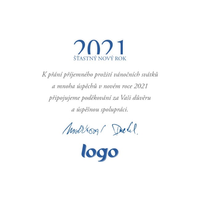 Toto vánoční přání je otevírací ve formě knížky (s textem přání a logo je uvnitř). Přání je do čtvercové obálky. Námi dodávané novoročenky a vánoční přání jsou tištěny na kvalitním 300g křídovém papíře.