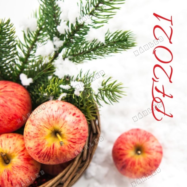 Vánoční přání s košíkem jablek s větvičkou ve sněhu