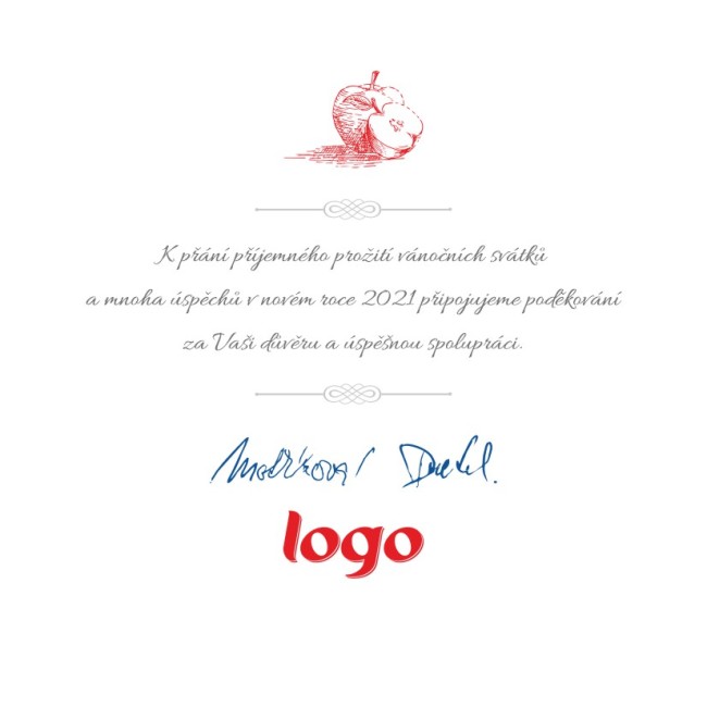 Toto vánoční přání je otevírací ve formě knížky (s textem přání a logo je uvnitř). Přání je do čtvercové obálky. Námi dodávané novoročenky a vánoční přání jsou tištěny na kvalitním 300g křídovém papíře.