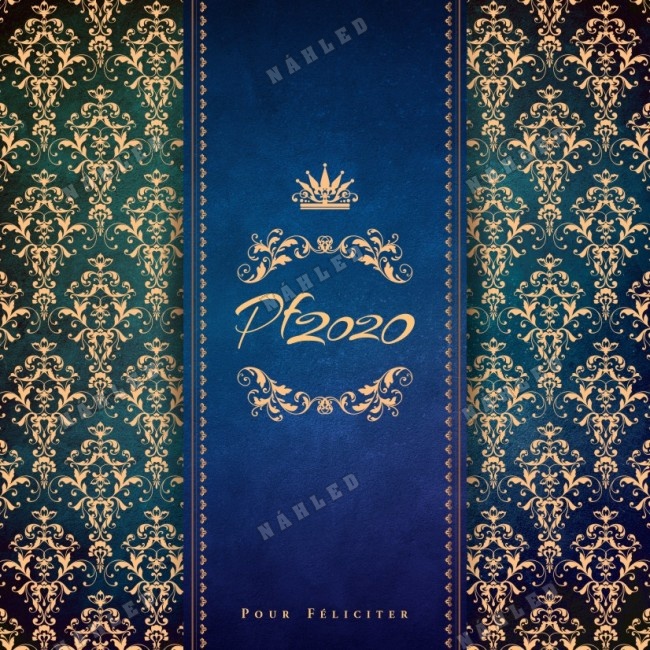 Modré vánoční přání s ornamenty a korunkou
