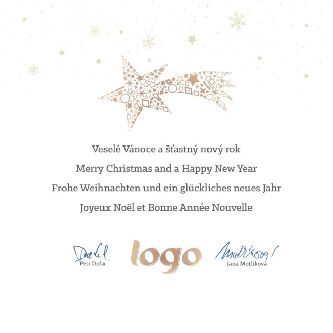Toto vánoční přání je otevírací ve formě knížky (s textem přání a logo je uvnitř). Přání je do čtvercové obálky. Námi dodávané novoročenky a vánoční přání jsou tištěny na kvalitním 300g křídovém papíře.