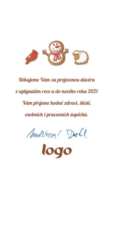 Toto vánoční přání je otevírací ve formě knížky (s textem přání a logo je uvnitř). Přání je do DL obálky. Námi dodávané novoročenky a vánoční přání jsou tištěny na kvalitním 300g křídovém papíře.